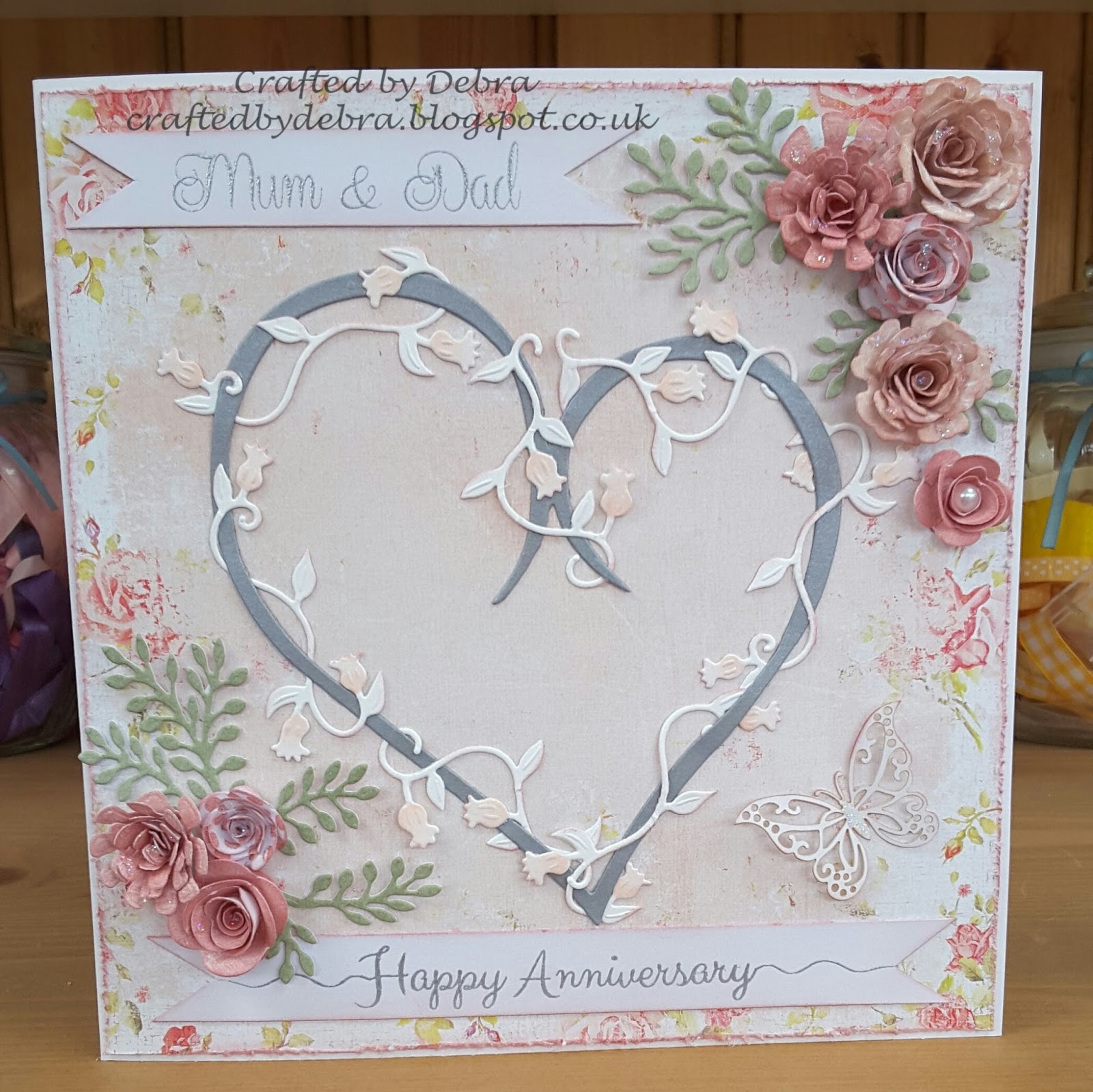 I made this for Stuart's mum and dad for their Wedding Anniversary last year. I'd fallen in love with Leonie Pujol's Entwined Collection heart die. Looking at the card now it looks at bit sparse for me but I'd probably left it to the last minute to make. Anyway, I hope you like it.